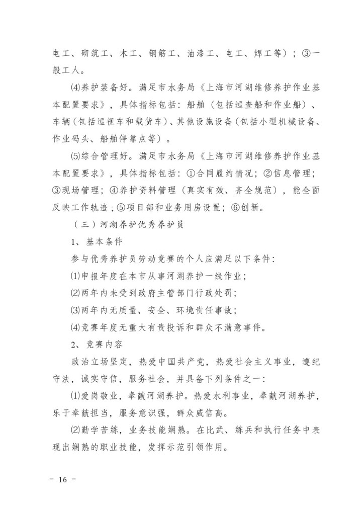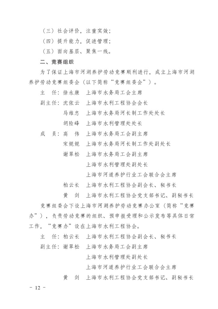 资格资质 2018年上海市河湖养护人员劳动竞赛工作安排“2018年上海市河湖养护人员劳动竞赛”由上海市水务局工会、上海市水利工程协会、上海市水利管理处、上海市河道养护行业工会联合会联合开展。具体工作安排和要求如下:一、竞赛范围(一)最美护河员参与本市水环境综合整治工作的个人(包括公务员、企业事业单位工作人员、社工、志愿者等),其中企业负责人、机关事业单位处级及以上干部不超过总数的10%,市管干部不参加评选。(二)河湖养护优秀个人本市注册或登记的企业中参与本市水环境综合整治工作的个人,市管干部不参加评选。二、竞赛工作安排(一)申报阶段2018年11月10日前,将申报表及证明材料报上海市河湖养护人员劳动竞赛办公室(以下简称:竞赛办)初审,电子版申报表可至市水利工程协会网站下载。(二)候选人公示阶段11月下旬,竞赛办在征询相关部门意见后,提出候选人初步名单,并向推荐单位反馈初审结果。提名候选人名在其所在单位范围内张榜公示,广泛听取意见。公示时间为5个工作日。公示结束后,推荐单位将公示意见及已公示证明材料报竞赛办。(三)评审阶段12月中下旬,竞赛办将申报材料及推荐单位公示意见报上海市河湖养护人员劳动竞赛组委会评审确定“上海市最美护河员”和“上海市河湖养护优秀个人”名单,经评审确定后的名单在市水务局和市水利工程协会网站公示,公示时间为5个工作日。三、申报材料(一)申报表1、上海市最美护河员申报表2、上海市河湖养护优秀个人申报表(二)相关荣誉奖项证明材料四、联系方式联 系 人:蒋德霞电 话:021-58465183传 真:021-58465150地 址:浦东新区居家桥路955弄1号楼503室邮 箱:903776576@qq.com协会网址:www.swea.org.cn附件1:上海市最美护河员申报表附件2:上海市河湖养护优秀个人申报表上海市水利工程协会2018年10月12日