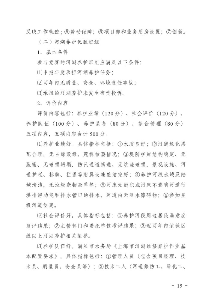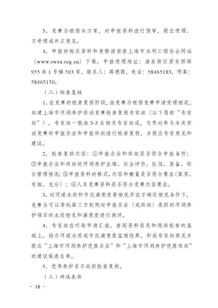 资格资质 2018年上海市河湖养护企业劳动竞赛工作安排一、竞赛范围在本市注册并从事河湖养护作业的企业。二、竞赛工作安排(一)申报阶段2018年11月10日前,各申报单位将申报材料报上海市河湖养护企业劳动竞赛办公室(以下简称“竞赛办”)预审。电子版申报表至市水利工程协会网站下载。(二)检查复核阶段11月11日-12月10日。竞赛办根据《“建设精品工程 营造生态河湖”劳动和技能竞赛实施意见》(沪水务(海洋)工会[2018]36号)规定结合当年度项目申报情况,组建由5-9名相关专家组成上海市河湖养护企业劳动竞赛专家组(以下简称“专家组”),负责对当年度申报项目进行复核。专家组根据申报材料和复核情况,形成专家组意见,提出“上海市河湖养护优胜企业”和“上海市河湖养护优胜班组”候选名单。(三)评审阶段12月中下旬,上海市河湖养护企业劳动竞赛组委会根据专家组提出的候选名单,以无记名投票方式评审确定“上海市河湖养护优胜企业”和“上海市河湖养护优胜班组”名单,经评审确定后的名单在市水务局和市水利工程协会网站公示,公示时间为5个工作日。公示期满无异议的,由市水务局工会和市水利工程协会联合发布竞赛结果。三、申报材料1、上海市河湖养护优秀企业申报表;2、上海市河湖养护优秀班组申报表;3、竞赛年度承接的河湖养护项目汇总表及业绩证明(班组申报可不提供);4、行业主管部门或业主单位组织第三方机构出具的水质抽样报告和养护项目周边居民满意度测评报告(如有);5、河湖养护企业人员汇总表及员工社保缴纳证明;6、本单位河湖养护装备汇总表及相关证明;7、营业执照、固定办公场所证明和现场项目部照片;8、竞赛年度获得的荣誉奖项汇总表及其复印件;9、多媒体视频材料(电子光盘2份,10分钟):企业概况、养护业绩、社会评价、养护队伍、养护装备、综合管理。四、联系方式联 系 人:蒋德霞电 话:021-58465183传 真:021-58465150地 址:浦东新区居家桥路955弄1号楼503室邮 箱:903776576@qq.com协会网址:www.swea.org.cn附件1:上海市河湖养护优秀企业申报表上海市水利工程协会2018年10月12日
