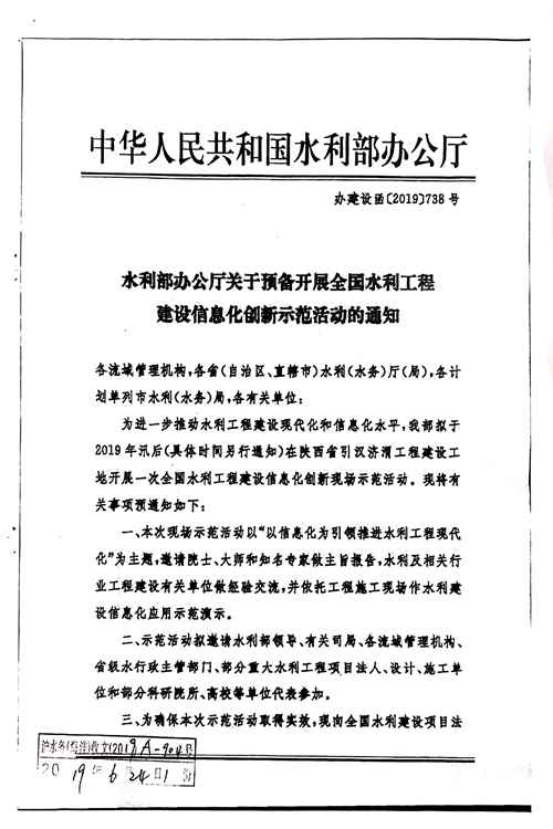 为配合和支持水利部开展全国水利工程建设信息化创新现场示范活动,展示上海水利工程建设现代化和信息化水平,现将《水利部办公厅关于预备开展全国水利工程建设信息化创新示范活动的通知》(办建设函〔2019〕738号)转发给你们,请项目设计、施工、激素支持等单位围绕智慧水务、GIS+BIM等工程建设信息化管理技术,形成书面材料,于8月23日前报市水利工程协会,成功范例和典型经验将由市水务局报送水利部。